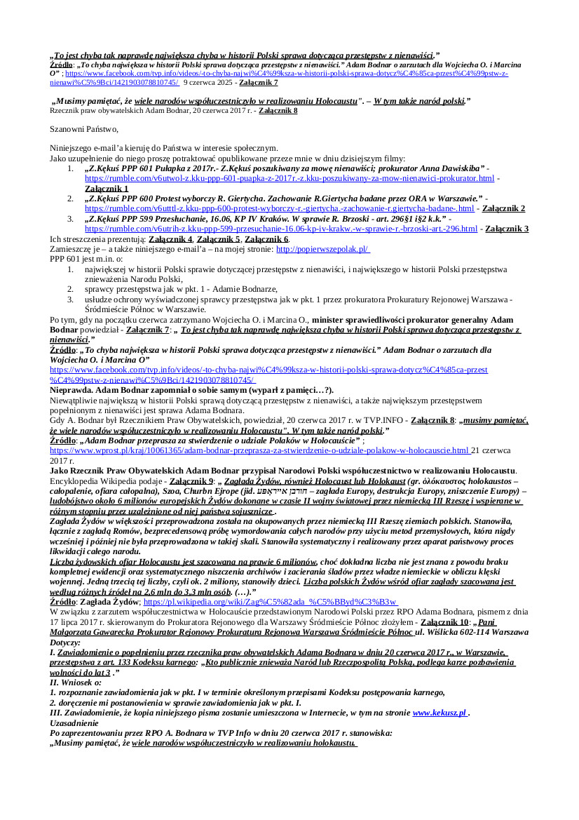 2025.06.16 E-mail Zbigniewa Kękusia do przedstawicieli opinii publicznej w sprawach: największej w historii Polski sprawy dotyczącej przestępstw z nienawiści oraz znieważenia Narodu Polski, tj. oświadczenia RPO Adama Bodnara 20 czerwca 2017 r. w TVP.INFO: „Musimy pamiętać, że wiele narodów współuczestniczyło w realizowaniu Holocaustu”. – W tym także naród polski.”; poszukiwania Z. Kękusia w związku postępowaniem prowadzonym przez prokurator Prokuratury Rejonowej Warszawa Śródmieście Annę Dawiskibę w sprawie do sygn. akt Ds.609.2017, z art. 257 k.k. (mowa nienawiści); złożenia przez Z. Kękusia, 13 czerwca, w KP IV w Krakowie, zawiadomienia o popełnieniu przez sędzię Sądu Rejonowego w Dębicy Beatę Stój ściganych z urzędu przestępstw z art. 231§1 i §2 k.k. oraz z art. 189§1 i §3 k.k.; protestu wyborczego adw. Romana Giertycha; prowadzenia przez Referat Skarg Okręgowej Rady Adwokackiej w Warszawie od marca 2025 r. czynności wyjaśniających w sprawie adw. R. Giertycha; przesłuchania Z. Kękusia 16 czerwca, godz. 16:00, w KP IV w Krakowie w sprawie o podejrzeniu popełnienia przez Rafała Brzoskę, w okresie od 18 grudnia 2013 r. do co najmniej 18 lutego 2016 r. przestępstwa z art. 296§1 i§2 k.k. (ew. także art. 296§3 k.k.).