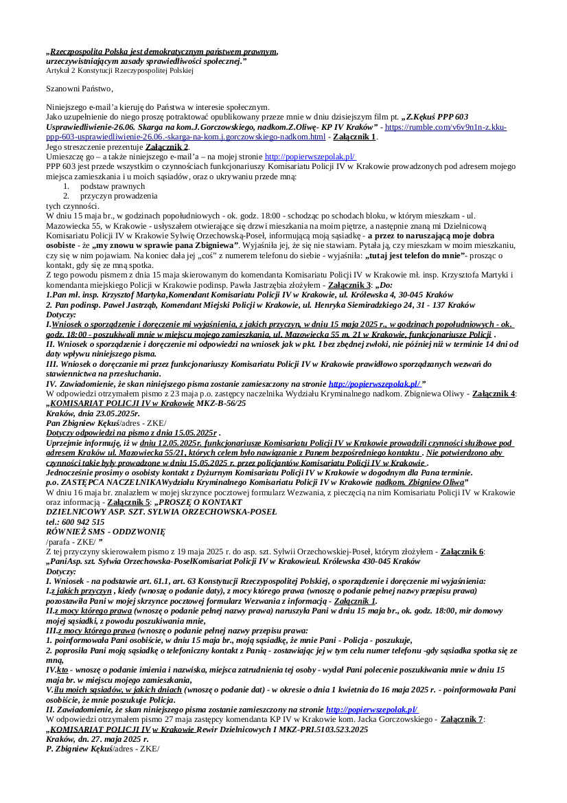 2025.06.25 E-mail Zbigniewa Kękusia do przedstawicieli opinii publicznej w sprawach: poszukiwania Z. Kękusia przez Policję w miejscu zamieszkania oraz u sąsiadów; odpowiedzi p.o. zastępcy naczelnika Wydziału Kryminalnego Komisariatu Policji IV w Krakowie nadkom. Zbigniewa Oliwy i zastępcy komendanta KP IV w Krakowie kom. Jacka Gorczowskiego na wnioski Z. Kękusia w sprawie podstaw prawnych oraz przyczyn poszukiwania go; skargi Z. Kękusia do ministra spraw wewnętrznych i administracji Tomasza Siemoniaka na nadkom. Zbigniewa Oliwę i kom. Jacka Gorczowskiego; usprawiedliwienia niestawiennictwa Z. Kękusia w KP IV w Krakowie 26 czerwca 2026 r. na wezwanie w związku z zawiadomieniem o popełnieniu przestępstwa przez m.in. sędzię Sądu Rejonowego dla Krakowa-Krowodrzy I Wydział Cywilny SSR Annę Serzysko i sędzię Sądu Okręgowego w Krakowie, II Wydział Cywilny-Odwoławczy SSR (del.) Annę Jawień.