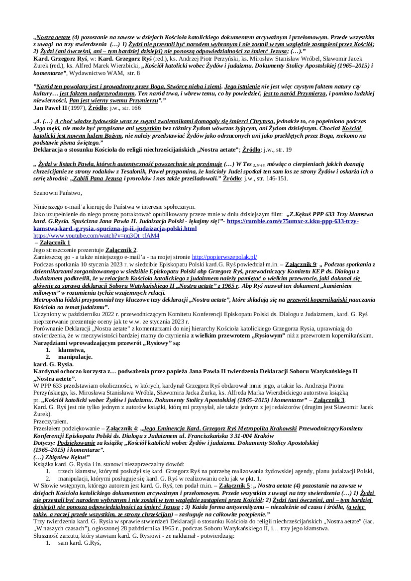 2026.02.17 E-mail Zbigniewa Kękusia do przedstawicieli opinii publicznej w sprawach: podważenia przez papieża Jana Pawła II twierdzenia Deklaracji Soboru Watykańskiego II „Nostra aetate”: „Chociaż Kościół jest nowym Ludem Bożym, (…).”; obdarowania Z. Kękusia przez metropolitę krakowskiego kard. Grzegorza Rysia książką pt. „Kościół katolicki wobec Żydów i judaizmu. Dokumenty Stolicy Apostolskiej (1965–2015) i komentarze”; przewrotu „Rysiowego” w Kościele; trzech kłamstw kard. G. Rysia w sprawie Deklaracji Soboru Watykańskiego II „Nostra aetate”; manipulowania przez kard. G. Rysia Katechizmem Kościoła katolickiego w sprawie winnych śmierci Jezusa; plecenia przez kard. G. Rysia, co mu ślina na język przyniesie; judaizacji Polski przez Donalda Tuska i kard. G. Rysia; pisma Z. Kękusia do przewodniczącego KEP Tadeusza Wojdy; wniosku Z. Kękusia do ministra spraw wewnętrznych i administracji Marcina Kierwińskiego w sprawie „Poradnika bezpieczeństwa” rządu D. Tuska.
