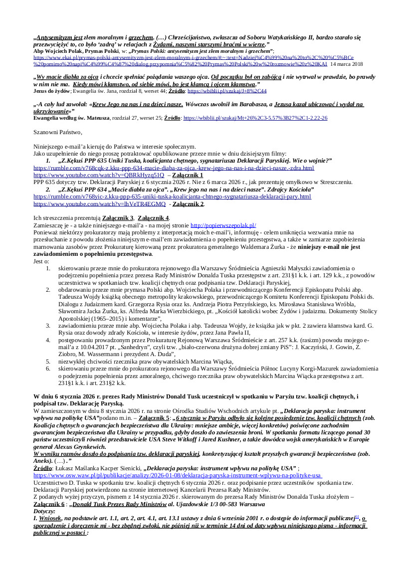 2027.02.25 E-mail Zbigniewa Kękusia do przedstawicieli opinii publicznej w sprawach: zawiadomienia przez Z. Kękusia prokuratora rejonowego dla Warszawy Śródmieścia A. Małyszki o podejrzeniu popełnienia przez premiera D. Tuska przestępstw z art. 231§1 k.k. i art. 129 k.k., z powodów uczestnictwa w spotkaniach tzw. koalicji chętnych oraz podpisania tzw. Deklaracji Paryskiej; obdarowania przez Z. Kękusia prymasa Polski abp. Polaka i przewodniczącego KEP abp. T. Wojdy książką kard. G. Rysia, ks. A. P. Perzyńskiego, ks. M. S. Wróbla, S. J. Żurka, ks. A. M. Wierzbickiego, pt. „Kościół katolicki wobec Żydów i judaizmu. Dokumenty Stolicy Apostolskiej (1965–2015) i komentarze”; zawiadomienia przez Z. Kękusia abp. W. Polaka i abp. T. Wojdy, że książka jak wyżej zawiera kłamstwa kard. G. Rysia oraz dowody zdrady Kościoła, przez Jana Pawła II; dochodzenia Prokuratury Rejonowej Warszawa Śródmieście prowadzonego od 2017 roku, z art. 257 k.k., z powodu e-mail’a Z. Kękusia z 10.04.2017 r. pt. „Sanhedryn”, czyli tzw. „biało-czerwona drużyna dobrej zmiany PiS”: J. Kaczyński, J. Gowin, Z. Ziobro, M. Wassermann i prezydent A. Duda”; zawiadomienia przez Z. Kękusia prokuratora rejonowego dla Warszawy Śródmieścia Północ Lucyny Korgi-Mazurek o podejrzeniu popełnienia przez chciwego RPO M. Wiącka przestępstwa z art. 231§1 k.k. i art. 231§2 k.k.